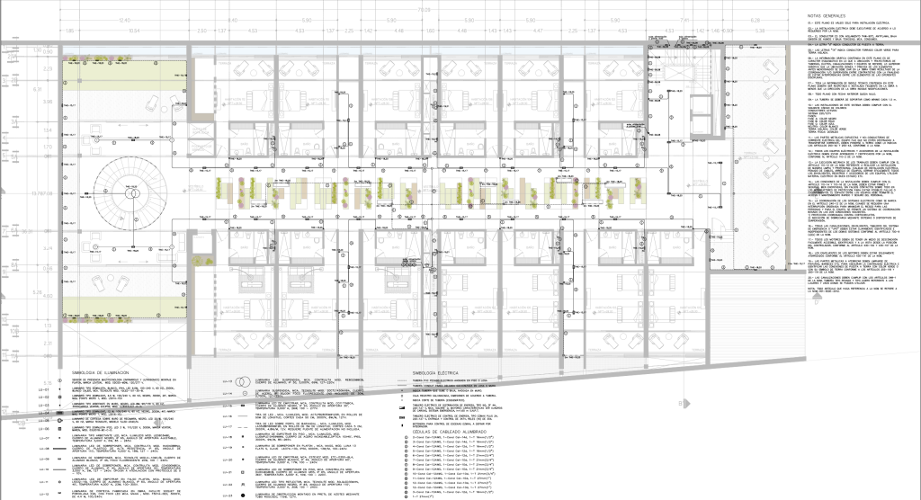 · Estudio y diseño de ilumina- ción · Distribución en baja tensión: – Normal y emergencia. – Alumbrado – Contactos – Fuerza – Alumbrado exterior · Sistemas de tierras y pararra- yos. · Distribución en media tensión: